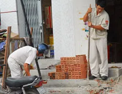 | Thanh tra xây dựng phá dỡ bậc thềm lấn chiếm vỉa hè trên quốc lộ 50, huyện Bình Chánh. Ảnh: HTD/PL |