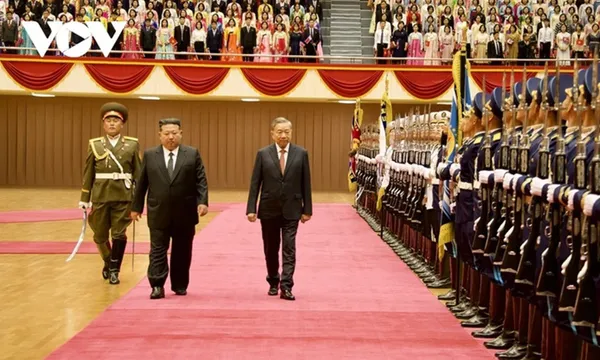 Tổng Bí thư Đảng Lao động Triều Tiên, Chủ tịch Quốc vụ nước Cộng hòa Dân chủ Nhân dân Triều Tiên Kim Jong Un đón và chào mừng Tổng Bí thư Tô Lâm thăm cấp Nhà nước tới Triều Tiên. Hai nhà lãnh đạo di chuyển đến hàng quan chức và giới thiệu quan chức hai nước, sau đó tiến lên bục danh dự. Đội quân nhạc cử quốc thiều hai nước, trên nền nhạc có bắn 21 loạt đại bác rền vang chào đón Tổng Bí thư Tô Lâm và Đoàn đại biểu cấp cao Việt Nam.