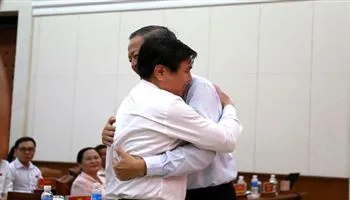 Chủ tịch UBND TPHCM Nguyễn Thành Phong xúc động chia tay ông Lê Văn Khoa. Ảnh: TNO