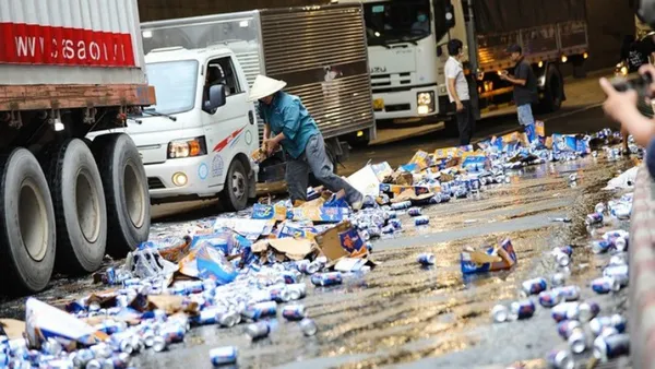 Vụ việc khiến các lon bia văng khắp mặt đường, gây ùn tắc giao thông cục bộ.
