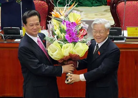 | Tổng bí thư Nguyễn Phú Trọng chúc mừng Thủ tướng Nguyễn Tấn Dũng. |