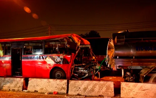 Chiều 23/2, ôtô khách 50 chỗ chở công nhân vừa tan ca chạy trên quốc lộ 1 hướng từ quận Thủ Đức đi vòng xoay An Lạc, TP HCM. Khi vừa qua hầm chui Tân Tạo (quận Bình Tân) 300 m, ôtô bất ngờ đâm thẳng vào xe bồn chở nhiên liệu đang đậu.