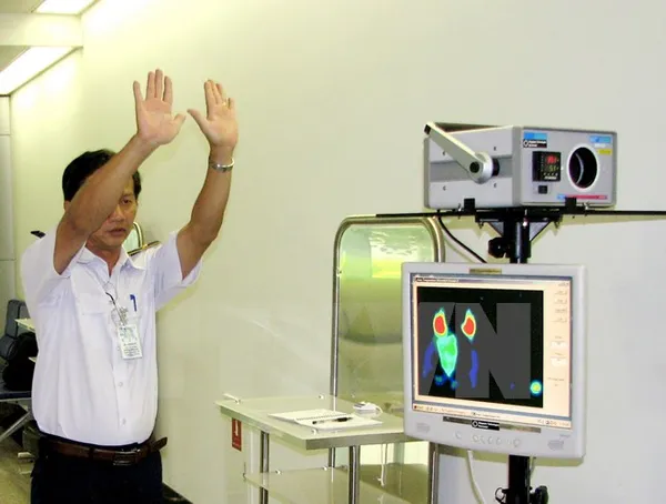 Lắp đặt thiết bị kiểm tra thân nhiệt hành khách tại Cảng hàng không Tân Sơn Nhất. (Ảnh: Thế Anh/TTXVN)
