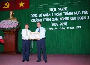 Đầu năm 2013, toàn quận có gần 4.100 hộ cận nghèo gồm hơn 21.300 nhân khẩu, với tỷ lệ trên 7% so với tổng số hộ dân trên địa bàn. Với mục tiêu hỗ trợ chăm lo cho hộ nghèo bằng nhiều biện pháp cùng lúc và đồng bộ, mang lại hiệu quả cao trong công tác giảm hộ nghèo: quận 6 phấn đấu đến cuối năm 2013 nâng thu nhập 100% hộ nghèo lên trên 13 triệu đồng/người/năm; 50% hộ có thu nhập dưới 14 triệu đồng/người/năm lên trên 14 triệu đồng/người/năm; 40% hộ có thu nhập dưới 15 triệu đồng/người/năm lên trên 15 triệu đồng/người/năm; đưa 15% hộ cận nghèo ra khỏi chương trình, hạ tỷ lệ hộ cận nghèo xuống dưới 6,3%, tránh tái nghèo và phát sinh hộ nghèo mới, tiến đến thoát nghèo bền vững./.