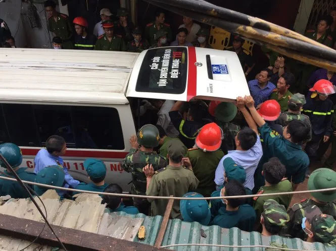 Nhiều xe cứu hỏa cứu thương, lực lượng bộ đội... đã có mặt tại hiện trường để tiến hành cứu hộ cứu nạn.