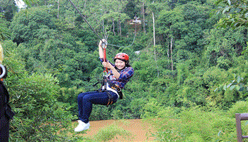 Trải nghiệm chơi Zipline (Đu dây tử thần) - một trò chơi mạo hiểm, người chơi sẽ băng qua các ngọn cây và sông hồ trong một quãng đường dài. Ảnh: mytour