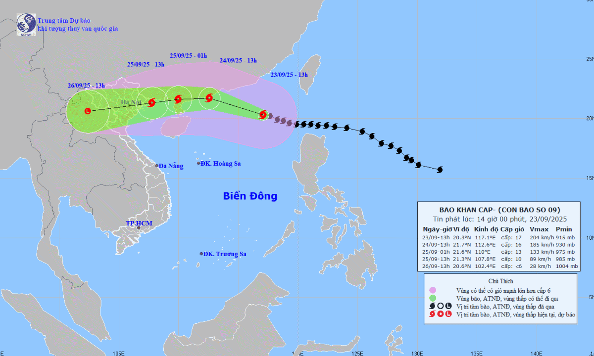Khoảng trưa đến chiều 25/9, vùng tâm bão nhiều khả năng đi vào đất liền Việt Nam, khu vực chịu ảnh hưởng trực tiếp là Quảng Ninh - Hải Phòng, lan đến Hưng Yên.