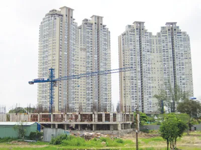 | Chung cư tái định cư P.22, Q.Bình Thạnh (tiền cảnh) chỉ đang xây phần móng, nhưng đã được rao bán suất - Ảnh: TNO |