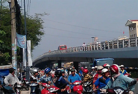 Người dân đứng lại quan sát vụ tai nạn nghiệm trọng trên cầu.