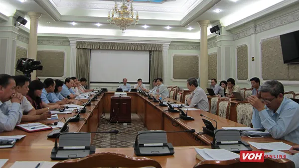 Phó Chủ tịch UBND TP Lê Văn Khoa nghe các Sở ngành quận huyện báo cáo về tình hình ô nhiễm môi trường tại bãi rác Đông Thạnh, huyện Hóc Môn vào chiều 28/7 tại TPHCM.