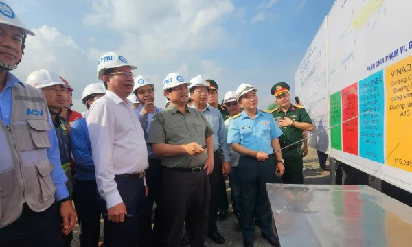 Thủ tướng Phạm Minh Chính tiếp tục di chuyển đến khu vực thi công nhà ga sân bay để kiểm tra hiện trạng và nghe báo cáo kết quả thi công cũng như tiến độ thực hiện.