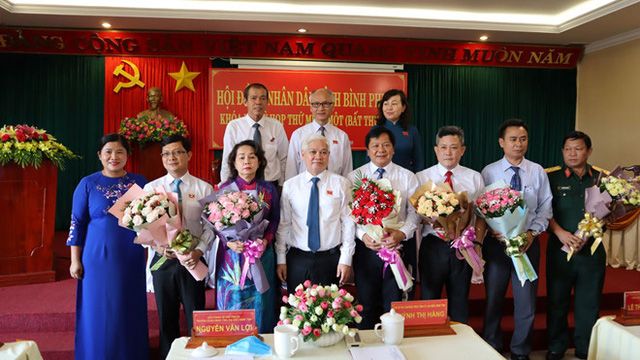 Lãnh đạo Tỉnh ủy - HĐND - UBND tỉnh Bình Phước tặng hoa chúc mừng các ông, bà được bầu giữ các chức vụ mới, thành viên UBND vào ngày 23/3. Ảnh: TQO