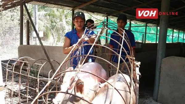 Heo sau khi tiêm thuốc mê được bỏ vào lồng đem đi tiêu hủy.