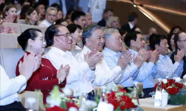 Tổng Bí thư Tô Lâm, nguyên Tổng Bí thư Nông Đức Mạnh và phu nhân dự chương trình.