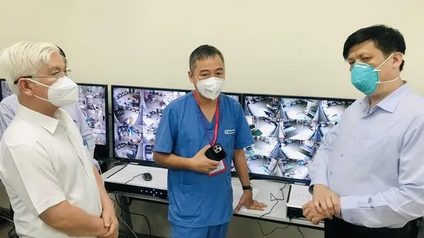 Bộ trưởng Bộ Y tế Nguyễn Thanh Long, Bí thư Tỉnh uỷ Bình Dương Nguyễn Văn Lợi nghe PGS.TS Nguyễn Lân Hiếu (giữa) báo cáo về hoạt động của Bệnh viện Dã chiến hồi sức cấp cứu người bệnh COVID-19 tỉnh Bình Dương - Ảnh: Bộ Y tế.