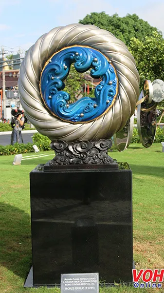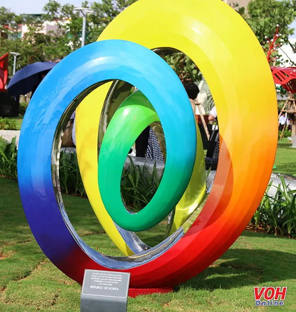 Trong số các tượng nghệ thuật được trưng bày tại vườn tượng, chủ nhà Việt Nam mang đến tác phẩm “Khởi nguyên” của Nhà điêu khắc Lê Lạng Lương, Đại học Mỹ thuật. Tác phẩm lấy cảm hứng từ sự tụ hội của những khối cây cổ thụ là biểu tượng cho sự cộng hưởng sức mạnh với muôn vàn các cột rễ xuất phát từ lòng đất, đan cài và tương hợp với nhau tạo nên khối sức mạnh khổng lồ đang vươn lên kiêu hãnh trong không gian mới.