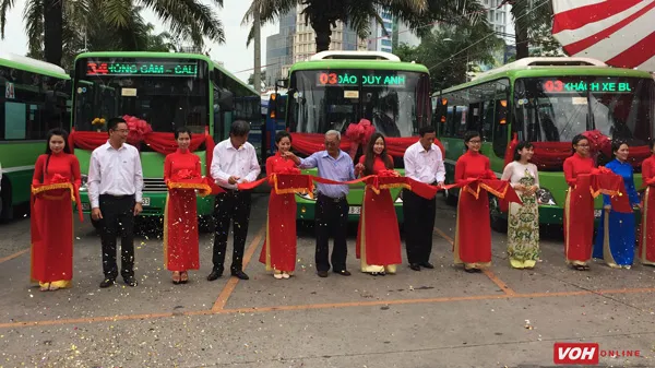 Các đại biểu cắt băng khai trương xe buýt mới trên tuyến 03 và 34 (Ảnh: Công Phán)