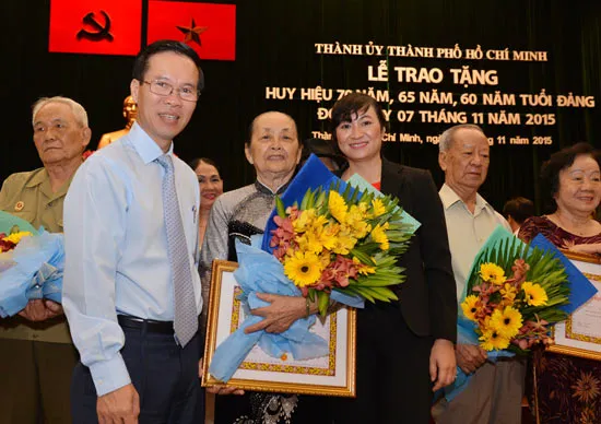 Phó Bí thư Thường trực Thành ủy TPHCM Võ Văn Thưởng trao Huy hiệu Đảng cho các đảng viên lão thành. Ảnh: SGGP