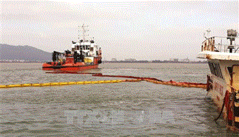 Trung tâm Quốc gia Ứng phó sự cố tràn dầu miền Trung triển khai việc hút dầu, trục vớt hàng trong tàu chìm ở biển Quy Nhơn hôm 16/11/2017. Ảnh: Nguyên Linh/TTXVN