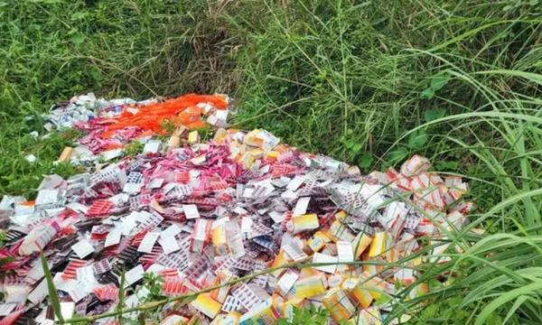Kết quả ghi nhận có đến 5 điểm đổ trộm, với tổng số khoảng 50kg thuốc và thực phẩm chức năng dành cho cả người lớn và trẻ em. Một số sản phẩm còn nguyên hộp, vỉ, có nhãn hiệu rõ ràng như Nattobet Q10, Cevinton Forte, Homrqmin Ginseng, Ginlobil, Vitamin A-D, yến sào, Anpha B3… Đáng chú ý, phần lớn số hàng này còn hạn sử dụng đến năm 2025-2026, chưa có dấu hiệu bị hư hỏng.