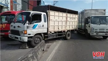 Sự việc khiến xe tải mất lái đâm dải phân cách rồi lao sang làn xe máy làm hai đoạn dải phân cách văng ra khỏi hàng chèn dưới gầm bánh xe tải nên chiếc xe này dừng lại.