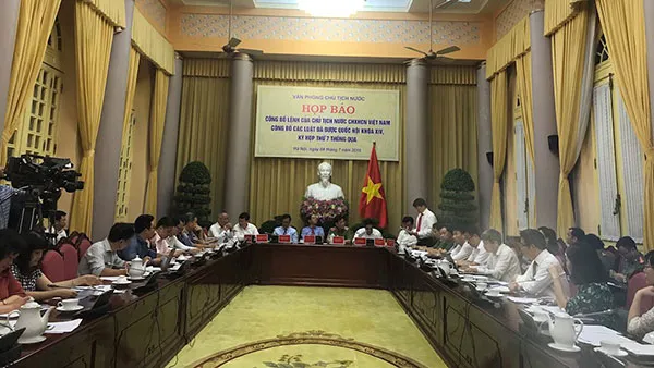 Sáng ngày 04/7, Văn phòng Chủ tịch nước tổ chức Họp báo công bố Lệnh của Chủ tịch nước công bố 07 Luật được Quốc hội Khóa XIV thông qua tại Kỳ họp thứ 7. Đồng chí Đào Việt Trung, Chủ nhiệm Văn phòng Chủ tịch nước chủ trì buổi họp báo