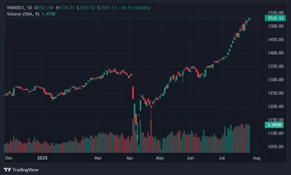 Chuyên gia từ Công ty Chứng khoán TPBank (TPS) cho rằng chỉ số đang vận động theo mô hình “cốc tay cầm”, với mục tiêu tiếp theo là 1.600 điểm. Riêng chỉ số VN30-Index được dự báo có thể tiến tới vùng 1.715 điểm nếu thanh khoản tiếp tục duy trì tích cực.