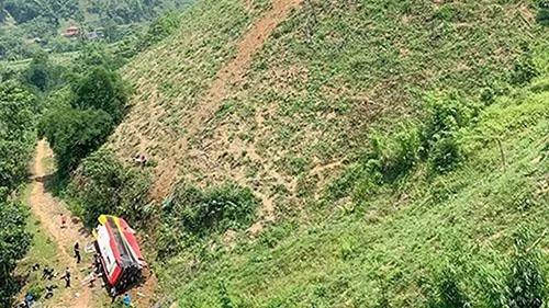 Sau khi đâm xuống chân đồi xe khách bị nằm nghiêng, đầu xe bể vụn, nhiều mảnh vỡ của chiếc xe bị văng ra xa. Vệt bánh xe lao xuống đồi in hằn trên đất.