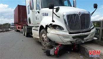 Khi đang lên dốc cầu thì bất ngờ lao qua trái cày nát dải phân cách, lao qua làn đường ngược lại, cuốn xe máy mang biển số 59X2… do một người phụ nữ điều khiển vào gầm. Chưa dừng lại, chiếc container tiếp tục lao thẳng vào thành cầu rồi mới dừng lại.