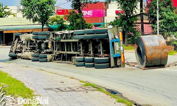 Trong lúc ôm cua bị lật dưới gầm cầu Đồng Nai, cuộn thép nặng hàng chục tấn trên xe rơi xuống đường, tài xế bị thương.