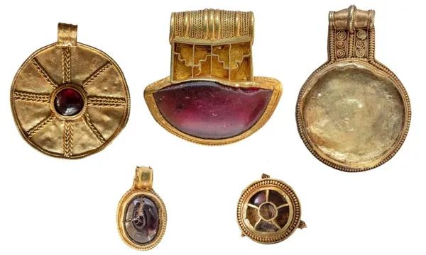 4 mặt dây chuyền bằng vàng, 1 trâm cài áo bằng vàng và ngọc hồng lựu có niên đại từ thế kỷ thứ bảy đã được tìm thấy ở Lincolnshire, Anh. - Ảnh: The Portable Antiquities Scheme (CC BY 2.0)