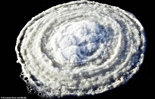 Đó là những vòng tròn xoáy ốc màu trắng nổi trên mặt nước được kết tụ bởi bọt nước, nhìn từ đằng xa chẳng khác gì những cái bánh pizza đang nối đuôi nhau trên dòng sông.