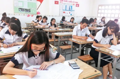 Học sinh lớp 12, Trường THPT Nguyễn Khuyến, quận 10 trong giờ thi thử môn Toán. Ảnh: Nhân dân