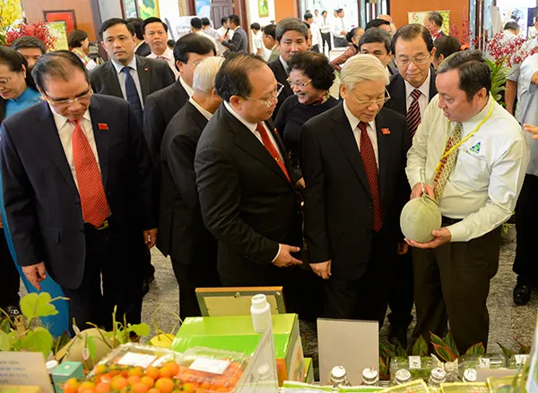 Các đồng chí lãnh đạo Đảng và Nhà nước tham quan tại khu vực triển lãm về Nông nghiệp công nghệ cao của TPHCM - Ảnh: K.Huân.