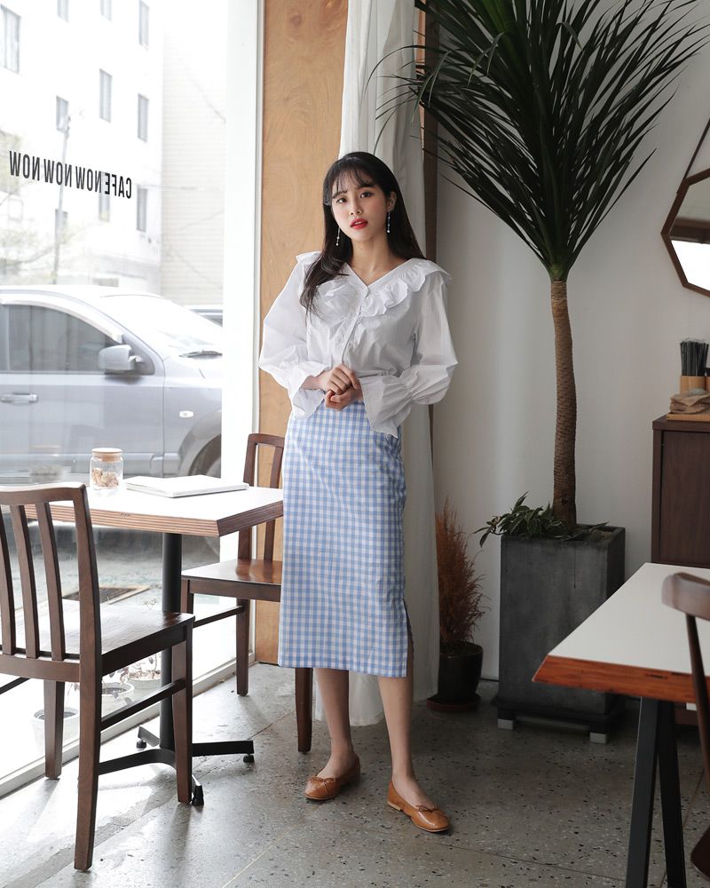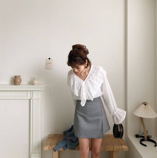 Những cô nàng nấm lùn có thể diện áo sơ mi tay loe cùng chân váy chữ A ngắn để ăn gian vóc dáng