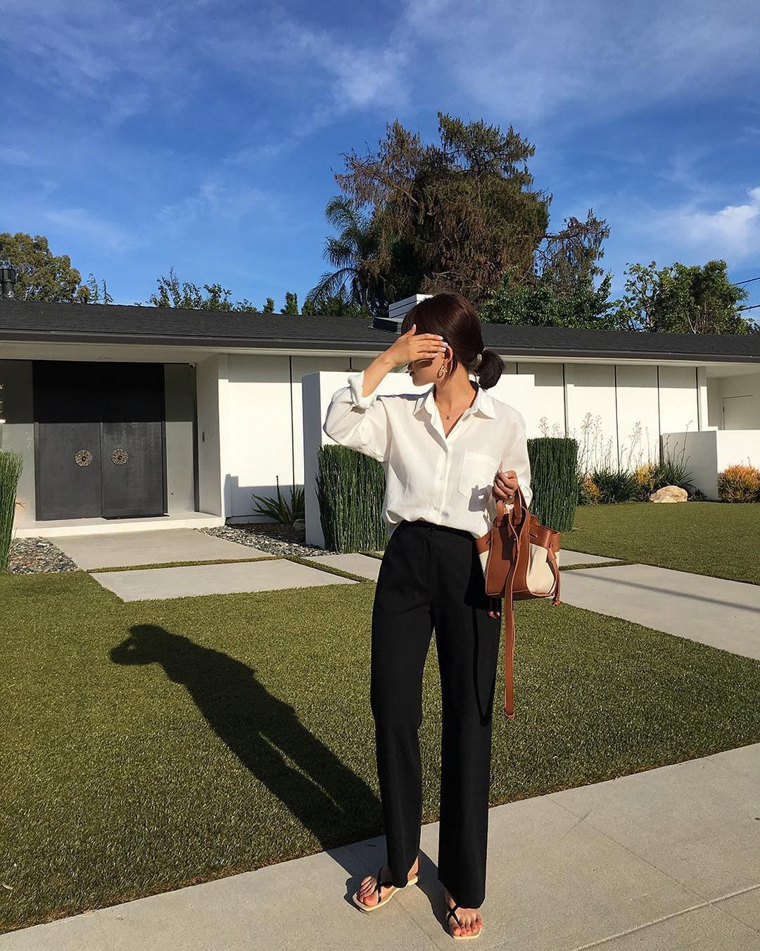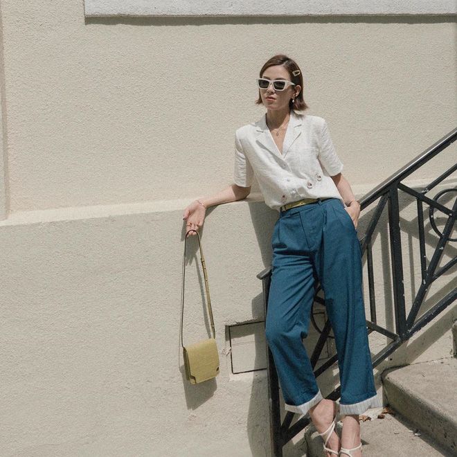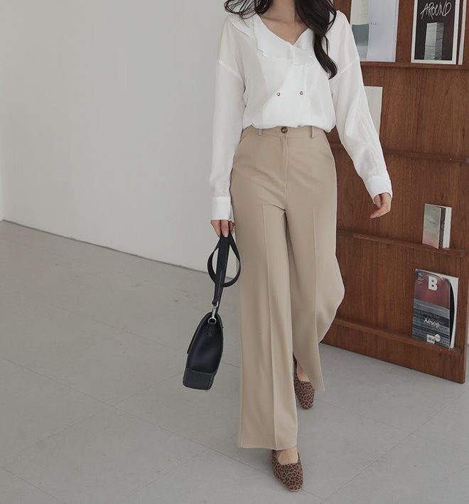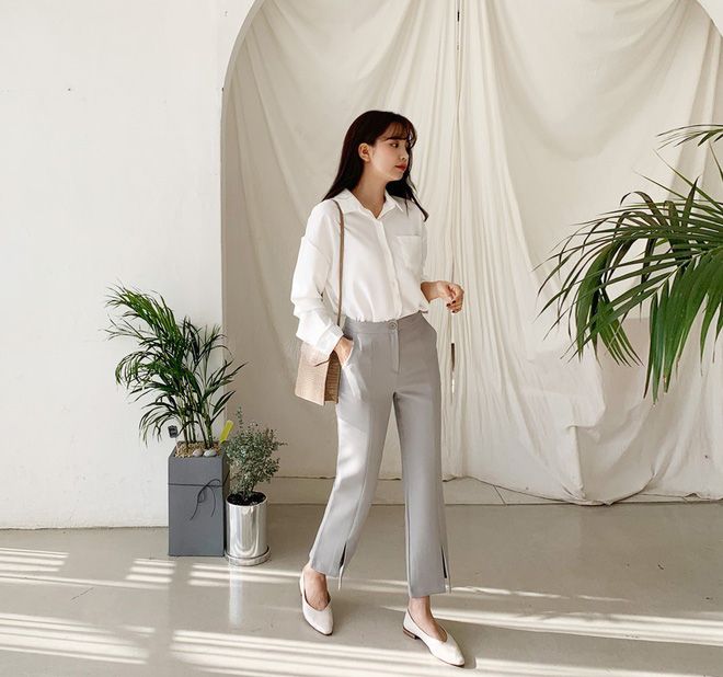 Bạn có thể chọn quần kaki, quần jean hay quần âu ống rộng để diện cùng áo sơ mi trắng. Tuy nhiên, đừng bỏ quên chi tiết lưng cao để ăn gian vóc dáng và giúp set đồ trở nên hợp mốt hơn. Đặc biệt, một nguyên tắc nhất định không được bỏ qua khi diện quần ống rộng là bạn phải sơ vin gọn gàng vào nếu không muốn bản thân trở nên thật luộm thuộm nhé.