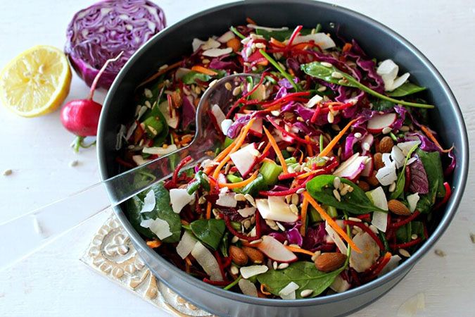 Rau màu xanh không phải là lựa chọn duy nhất mà bạn có thể sử dụng khi làm salad. Cơ thể chúng ta cũng cần các loại vitamin khác nhau có trong các loại rau đầy màu sắc như đỏ (ớt chuông, cà chua…), trắng (nấm, hẹ tây…), cam (cà rốt, bí…), tím (cà tím, bắp cải tím...)… Ngoài ra, một món ăn tạo được hiệu ứng thị giác tốt thì cũng sẽ thúc đẩy cảm giác ngon miệng do đó hãy cố gắng tạo ra sự đa dạng cho công thức chế biến salad của mình.