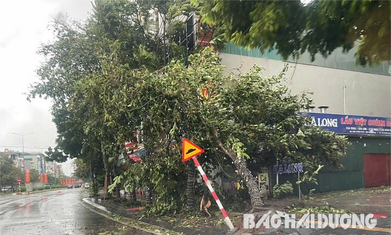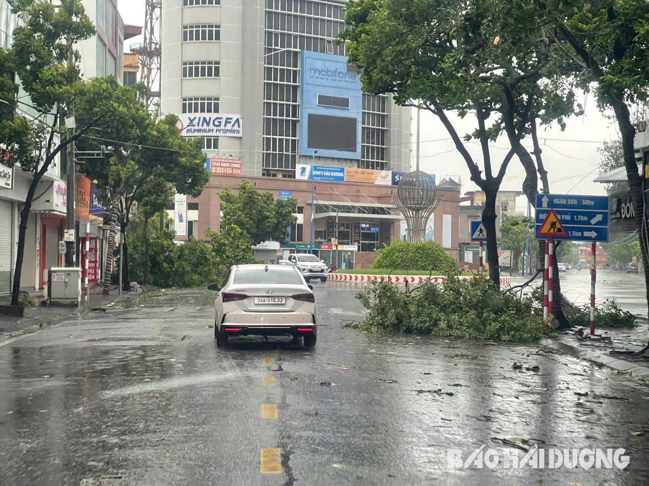 Trên nhiều tuyến đường chính của TP Hải Dương như khu vực gần Quảng trường Độc Lập, phố Quang Trung, Trần Hưng Đạo, Nguyễn Văn Linh..., hàng loạt cây xanh bị bật gốc, biển báo giao thông gãy đổ.