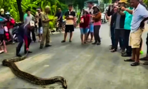 Sau khi bắt được, con trăn đất nặng 45kg, dài hơn 3m được chuyển về Trạm cứu hộ động vật hoang dã Hòn Me (huyện Hòn Đất) để kiểm tra sức khỏe, chăm sóc trước khi trả lại môi trường rừng tự nhiên.