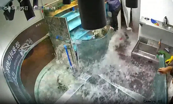 Các nhân viên đang bận rộn trong bếp thì bể chứa mới lắp đặt bất ngờ vỡ, khiến nước tràn vào nhà hàng và cả đàn cá tràn ra ngoài.