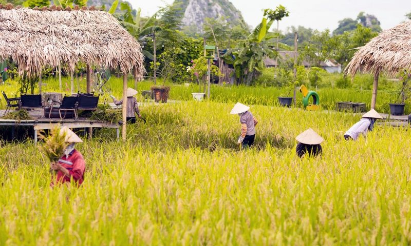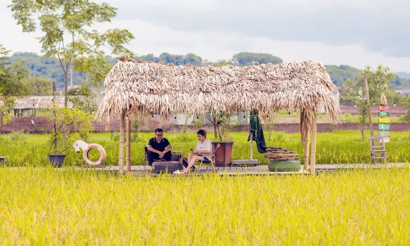 Cuối tháng 5, đầu tháng 6 là lúc cả cánh đồng lúa chuyển dần từ vàng sang xanh và bắt đầu bước vào mùa gặt. Nếu may mắn đến quán đúng ngày gặt, du khách sẽ được trải nghiệm gặt lúa cùng bà con, tha hồ hít hà hương lúa thơm nồng.