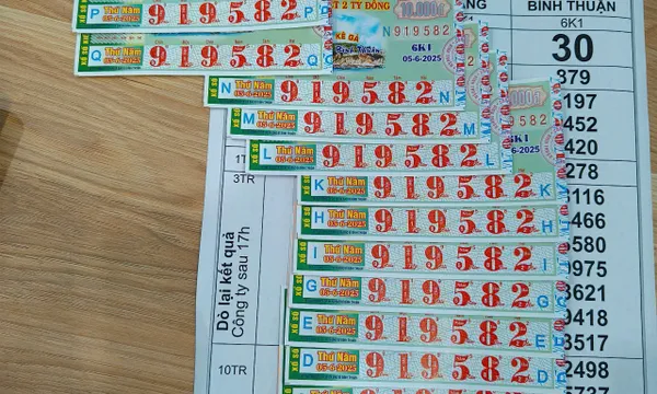 14 tờ vé số trúng độc đắc có dãy số 919582 thuộc đài Bình Thuận - Ảnh: TNO.