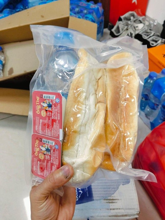 Đồ ăn được chia đều vào các túi nhỏ. Mỗi túi gồm 1-2 chai nước lọc, sữa đặc kèm đồ ăn, sau đó hút chân không.
