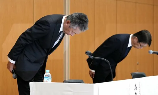 Chủ tịch Suntory Holdings Nobuhiro Torii (trái) và Phó chủ tịch điều hành Kenji Yamada xin lỗi về việc ông Takeshi Niinami từ chức chủ tịch tại một cuộc họp báo ở Tokyo vào ngày 2/9/2025 - Ảnh: Kyodo