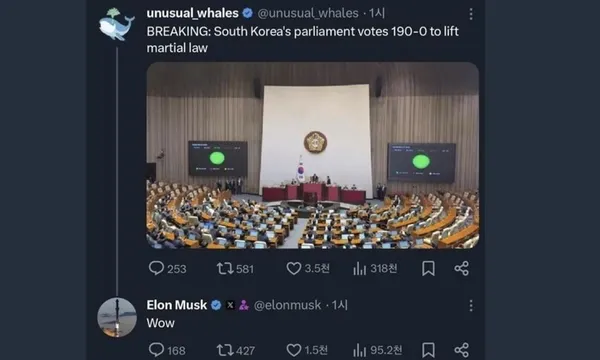 Khoảng 3 giờ sau, tỷ phú này lại bình luận "Ồ" trên một bài đăng khác về việc Quốc hội Hàn Quốc nhất trí thông qua nghị quyết dỡ bỏ thiết quân luật, kèm theo một bức ảnh của Quốc hội.