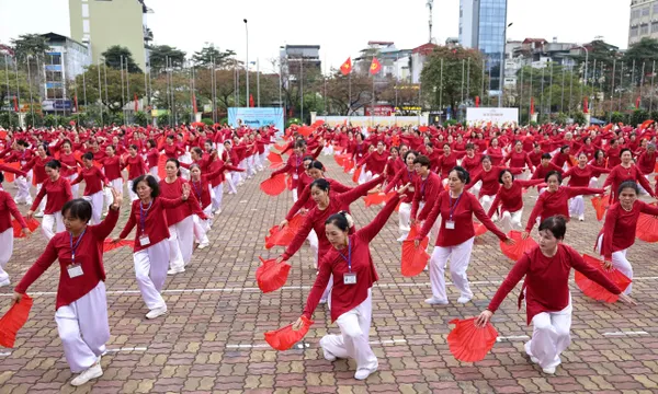 Ngày hội xác lập kỷ lục múa quạt dưỡng sinh thu hút gần 3.000 người trung, cao tuổi từ các phường, xã Hà Nội tham gia, tạo không khí sôi nổi, lan tỏa lối sống khỏe.