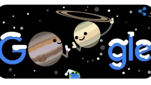 Trang chủ Google xuất hiện biểu tượng Hành tinh đôi Đông chí – biểu hiện cho sự kiện mà 60 năm mới có một lần, đó là hiện tượng Sao Thổ và Sao Mộc xuất hiện cực kỳ gần nhau, từ trái đất có thể thấy được điều này bằng mắt thường.
