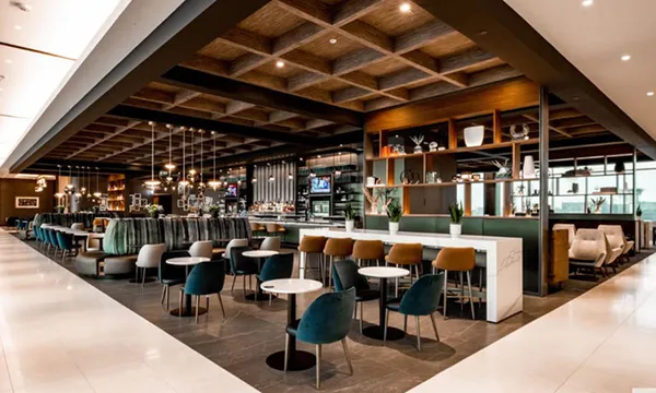 Nó có sức chứa 506 khách, quầy bar 16 chỗ ngồi, tường theo phong cách nhà hát, buồng điện thoại cách âm để "làm việc tập trung" và "tầm nhìn toàn cảnh sân bay".
