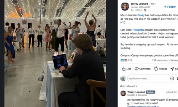 Một tấm hình đang viral trên LinkedIn cho thấy đồng sáng lập startup AI Thoughtly Casey Mackrell đang ngồi làm việc trên laptop ngay tại đám cưới của chính mình. Trong bài post, đồng nghiệp và đồng sáng lập của Mackrell tại startup cho hay anh còn được gọi là "cái gã hay ngồi ôm laptop tại bar" khắp San Francisco và New York.