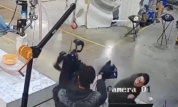 Trong đoạn video lan truyền mạnh mẽ trên mạng xã hội, robot bất ngờ vung tay chân loạn xạ khi đang được treo lên từ cần cẩu xây dựng, làm đổ thiết bị, kéo ngã giá đỡ và khiến hai kỹ thuật viên hoảng loạn tìm cách né tránh.
